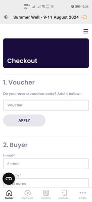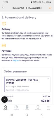 Salut @mihai1_popescu . Aplicația de rezervare este funcțională și încercată chiar acum. Așadar, pe telefon cu Android, din aplicația MyOrange  accesezi secțiunea de evenimente, și alegând SummerWell, după checkout, redirecționeză pe pagina de mai jos, unde editezi datele tale și faci plata. Nu ar trebui să fie probleme nici la plată. Mai încearcă și vezi să "accepți cookies". Succes.