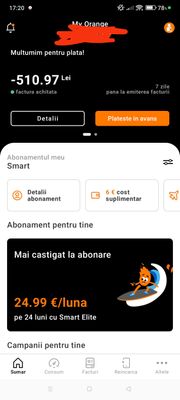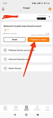 Poți face acest lucru din aplicația my Orange accesând secțiunea Facturi și apoi apeși plata in avans.