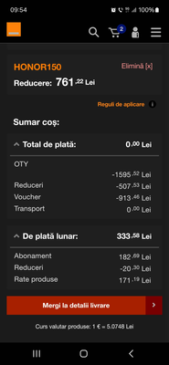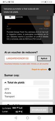 Ajutați-mă va rog cu mică problema. Doresc să îmi iau un Honor 200 pro la precomanda, cu modificarea abonamentului, cu plata în rate pe factura. Se acorda o reducere de 150€ cu voucherul LANSAREHONOR150. Însă în momentul în care îl introduc, îmi apare ca nu este un voucher valid. Ce nu fac bine?