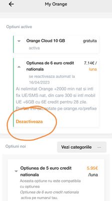 Cu toate astea, din aplicatia My Orange > Altele > Tarife si Optiuni, ar trebui sa poti dezactiva o optiune recurenta. Sa inteleg ca la tine nu apare nimic in acea sectiune? Sau nu apare nicio optiune activa? Poti sa pui un screenshot cumva?