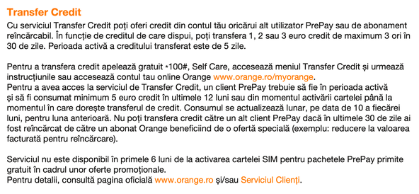 Aveam 24 Euro pe cartela Prepay și am vrut să îi transfer către un alt număr Prepay. De la *100# am putut transfera doar 9 Euro, ulterior mi-a afișat să revin luna următoare. Am sunat la Serviciul Clienți Orange și mi-au spus că ei nu pot transfera restul de 15 Euro direct din centrală. Ciudat...cine o fi gândit sistemul ăsta?