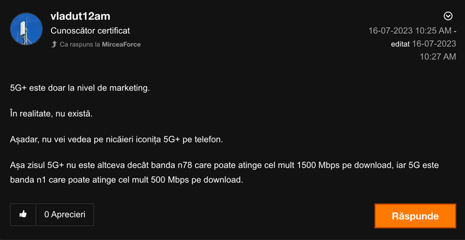 Telefonul nu afișează iconița 5G+, tot 5G rămâne însă se face CA între banda N78 și N1. Telefoanele cu procesoarele qualcomm nu prea se împacă cu agregarea huawei de la ORO și de multe ori crapă modemul, din cauză că rețeaua nu a fost optimizată/actualizată de când s-a lansat. Poate, odată cu noul swap la Ericsson să beneficiem de 5G+ ca la carte.