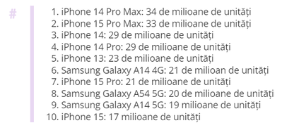 Potrivit analizei, în topuri s-au situat modelele flagship Apple și cele mid range Samsung: