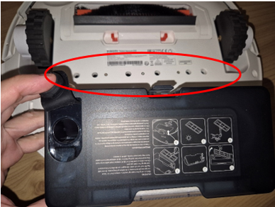 Mai în detaliu, observați în imagine atât locul de alimentare/umplere cu apă a rezervorului, respectiv (pe partea inferioară a robotului) fantele prin care apa ajunge să fie dozată către talpa cu lavetă/mop pentru spălarea / ștergerea pardoselii/gresiei cu materialul umed asemenea unui mop. Conform celor menționate și în instrucțiuni, materialul textil aferent mopului este lavabil și se poate curăța / limpezi prin spălare / stoarcere / uscare / re-atașare pe suport (talpă) în vederea unei viitoare reutilizări.