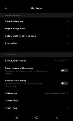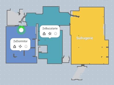După o scanare completă și o configurare a încăperilor locuinței, harta ar trebui să arate conform imaginii anterioare. Se pot configura programe generale de funcționare, dar și particularizate în funcție de specificul fiecărei camere: ca putere de aspirare, dacă să fie doar aspirare, sau doar mop sau ambele, dacă să se facă o dublă trecere a aspiratorului prin camera respectivă sau doar o singură dată. Toate aceste configurări se regăsesc în aplicație conform imaginii atașate mai jos: