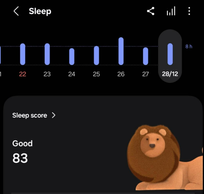 • pe baza unor informatii (durata somului, recuperare psihica, odihna, recuperare mentala, cicluri de somn), intreg ciclul de somn dintr-o noapte, inregistrat pe mai multe zile, primeste un icon, sub forma unui animal, care reflecta cum dormi (momentan sunt un leu, cu un scor de 83, identificat de ei ca fiind bun.