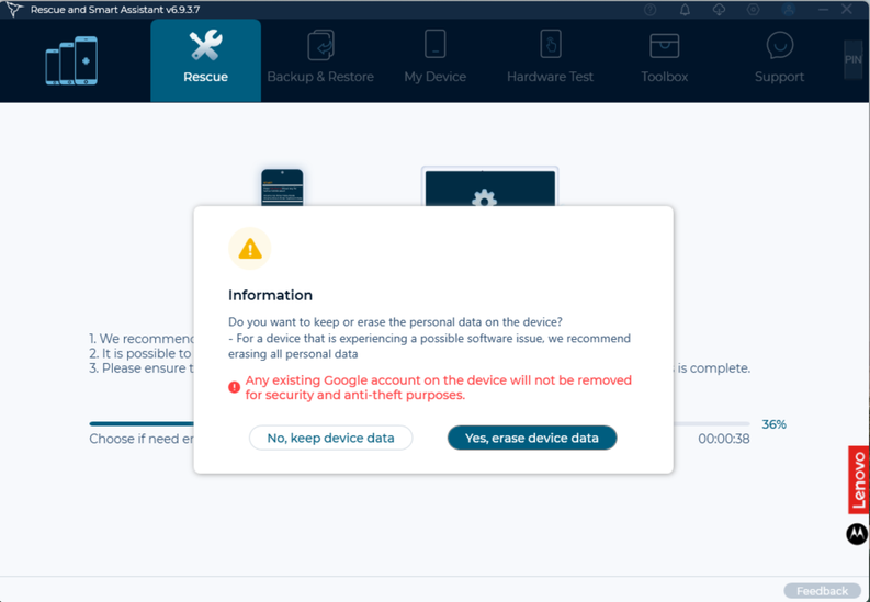 In momentul in care totul este pregatit (telefon conectat prin cablu de date, conexiune sigura, PC-ul sa nu aiba probleme de alimentare cu curent/baterie), dam click pe Rescue, citim informatiile de pe fereastra de mai jos, si apoi click pe Proceed.
