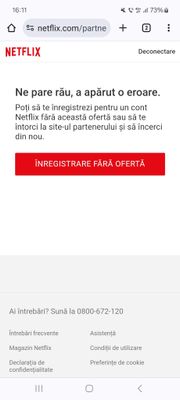 Știe cineva de ce când vreau sa activez opțiunea Netflix cu plată de către Orange pe factura de abonament mobil îmi spune că : Înregistrare fără ofertă. Poți să te înregistrezi pentru un cont Netflix fără această ofertă sau să te întorci pe site-ul partenerului și să încerci din nou.